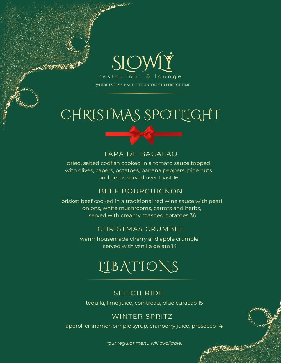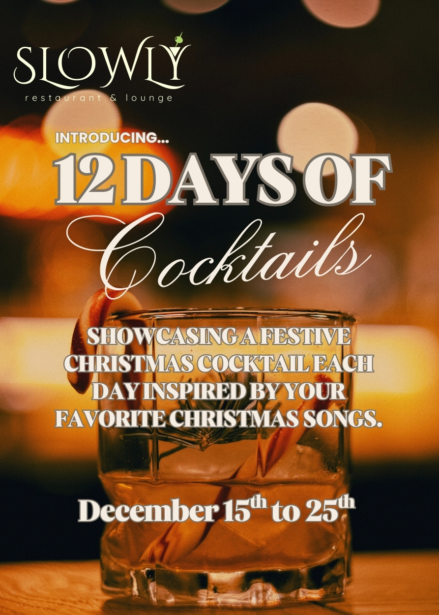 Celebrate the holidays at Slowly with Christmas Day specials and our 12 Days of Cocktails from December 15–25. Enjoy festive dishes, winter cocktails, and a warm, cozy atmosphere all season long.