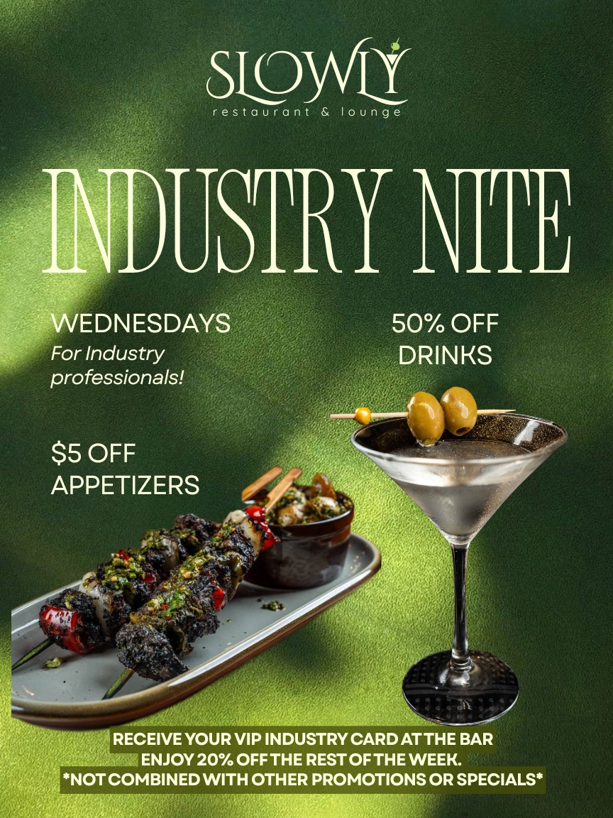 WEDNESDAYSIndustry professionals! Every Wednesday enjoy 50% off Drinks and $5 off Appetizers. Receive your Industry VIP Card at the bar. Enjoy 20% off the rest of the week. *Not combined with other promotions or specials*